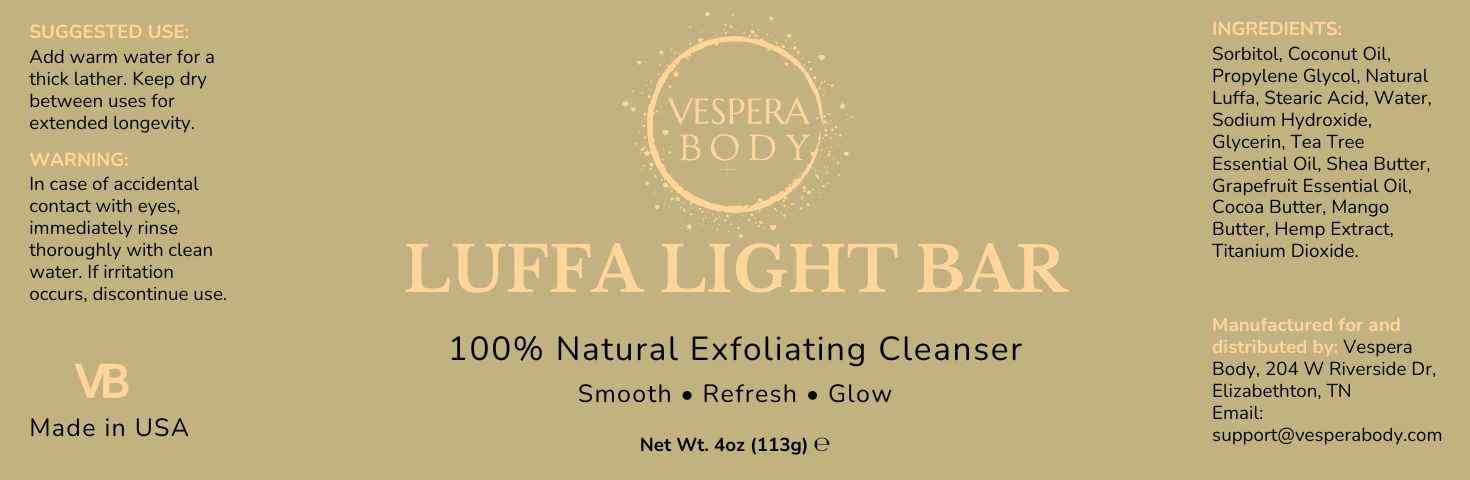 Luffa Light Bar is Vespera Body's handcrafted exfoliating cleanser, designed to gently lift away dullness and restore glow. Made with natural luffa fibers and a nourishing blend of coconut oil, shea butter, mango butter, and hemp extract, this bar delivers biodegradable exfoliation that’s kind to your skin and the planet.